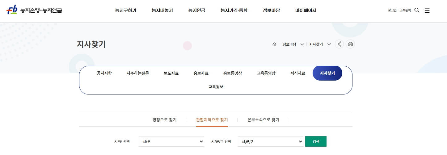 - 시/도 선택 후 ▶ 시/군/구 선택 후 검색